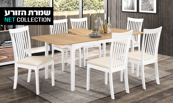 פינת אוכל דגם 'מיקס' בצבע לבן משולב אלון טבעי עם 6 כסאות ו-2 הגדלות לאירוח מושלם