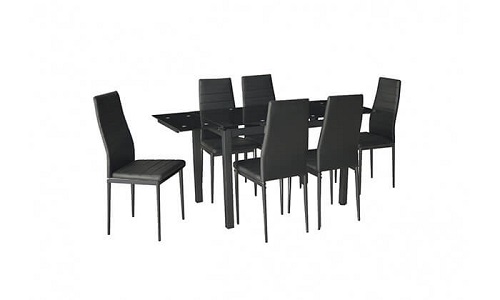 שולחן פינת אוכל עשוי עץ בשילוב מתכת כולל שישה כיסאות בריפוד דמוי עור