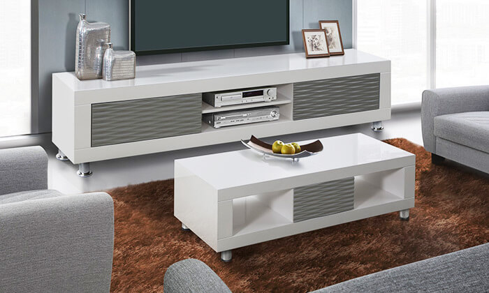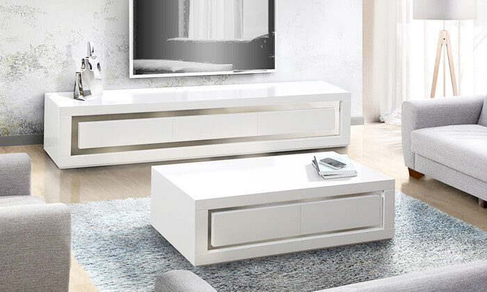 מערכת מזנון ושולחן לסלון בצבע לבן בגימור אפוקסי